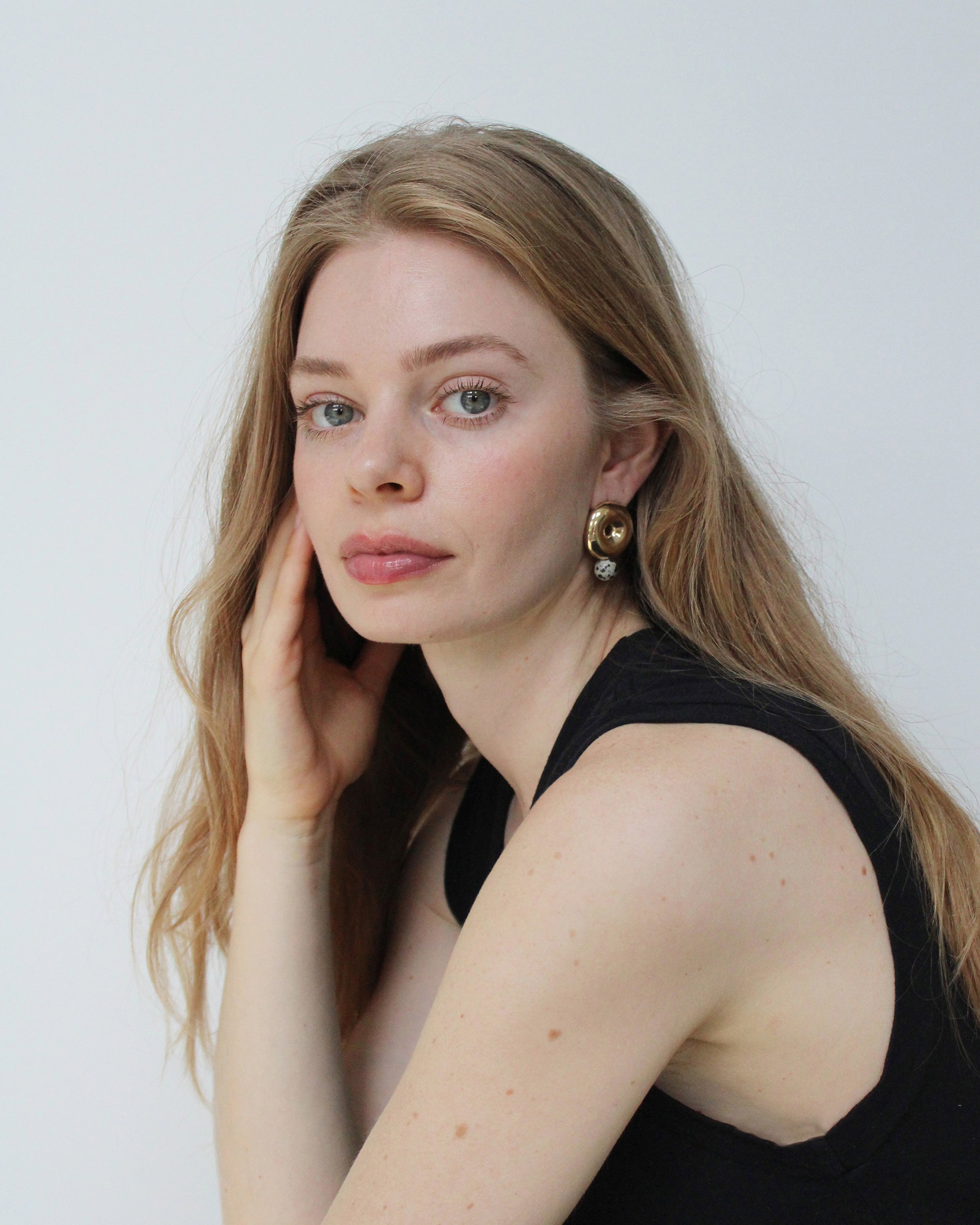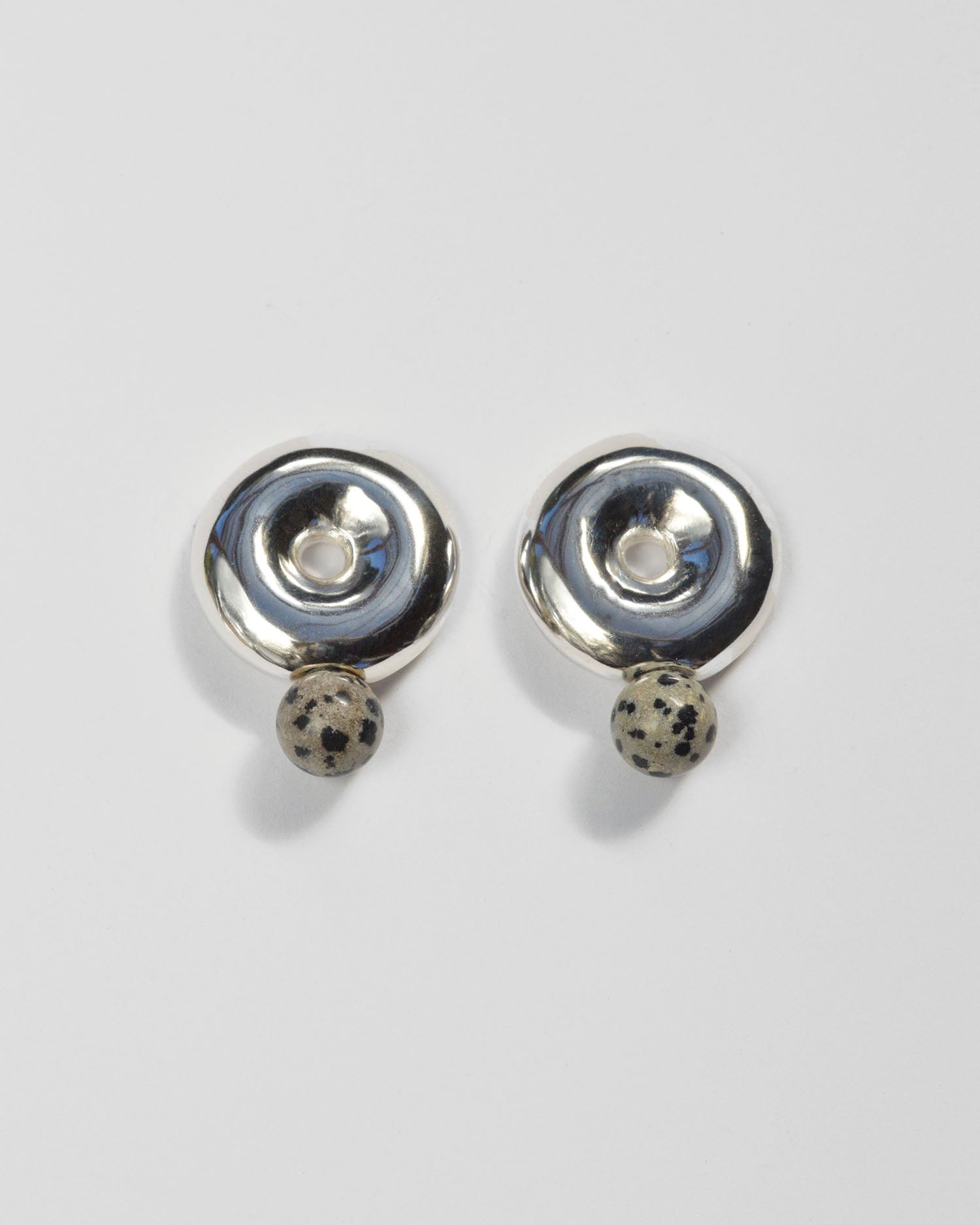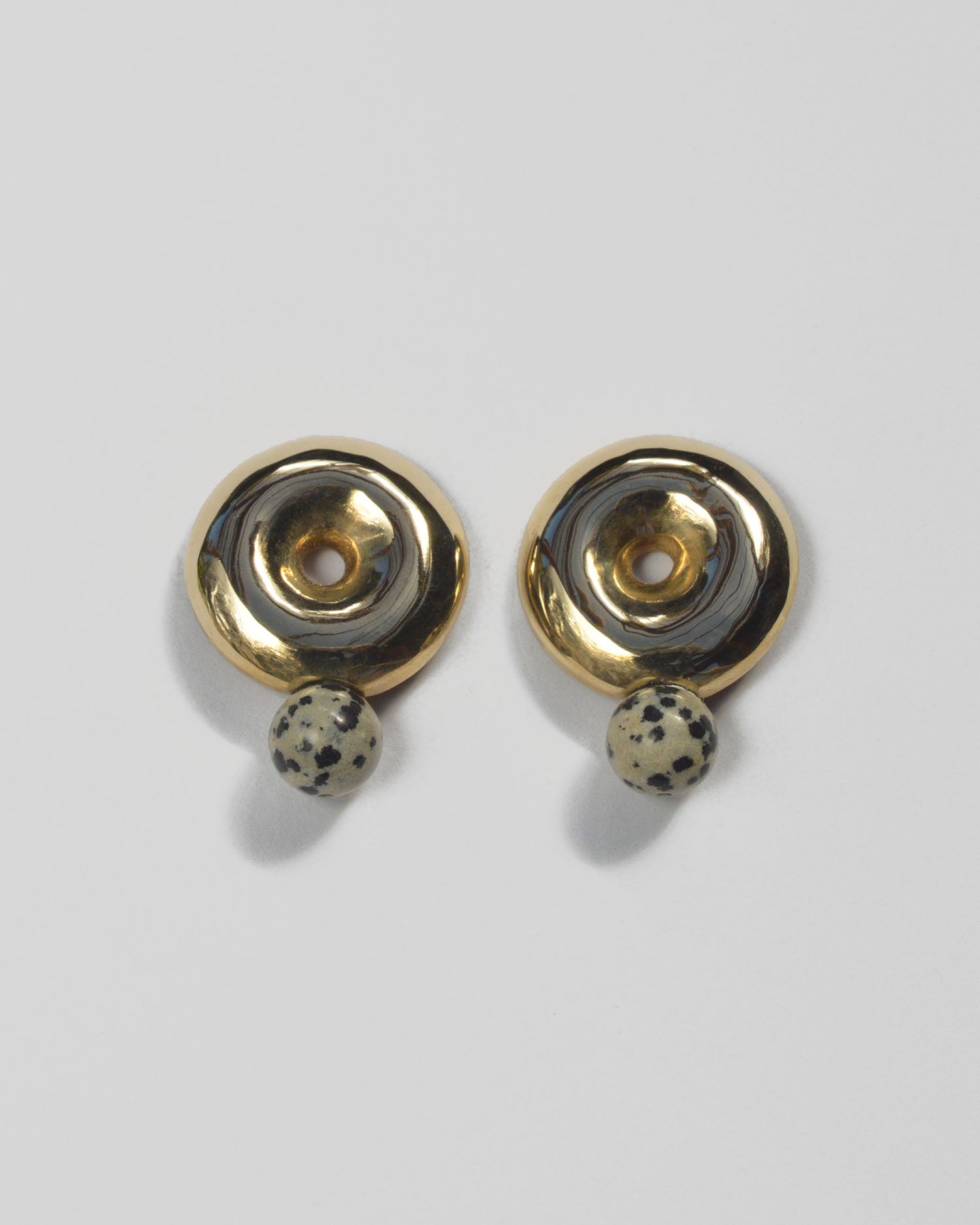 A study in form and balance. Sculpted circular statement earrings in solid brass or silver, set with dalmatian jasper spheres.