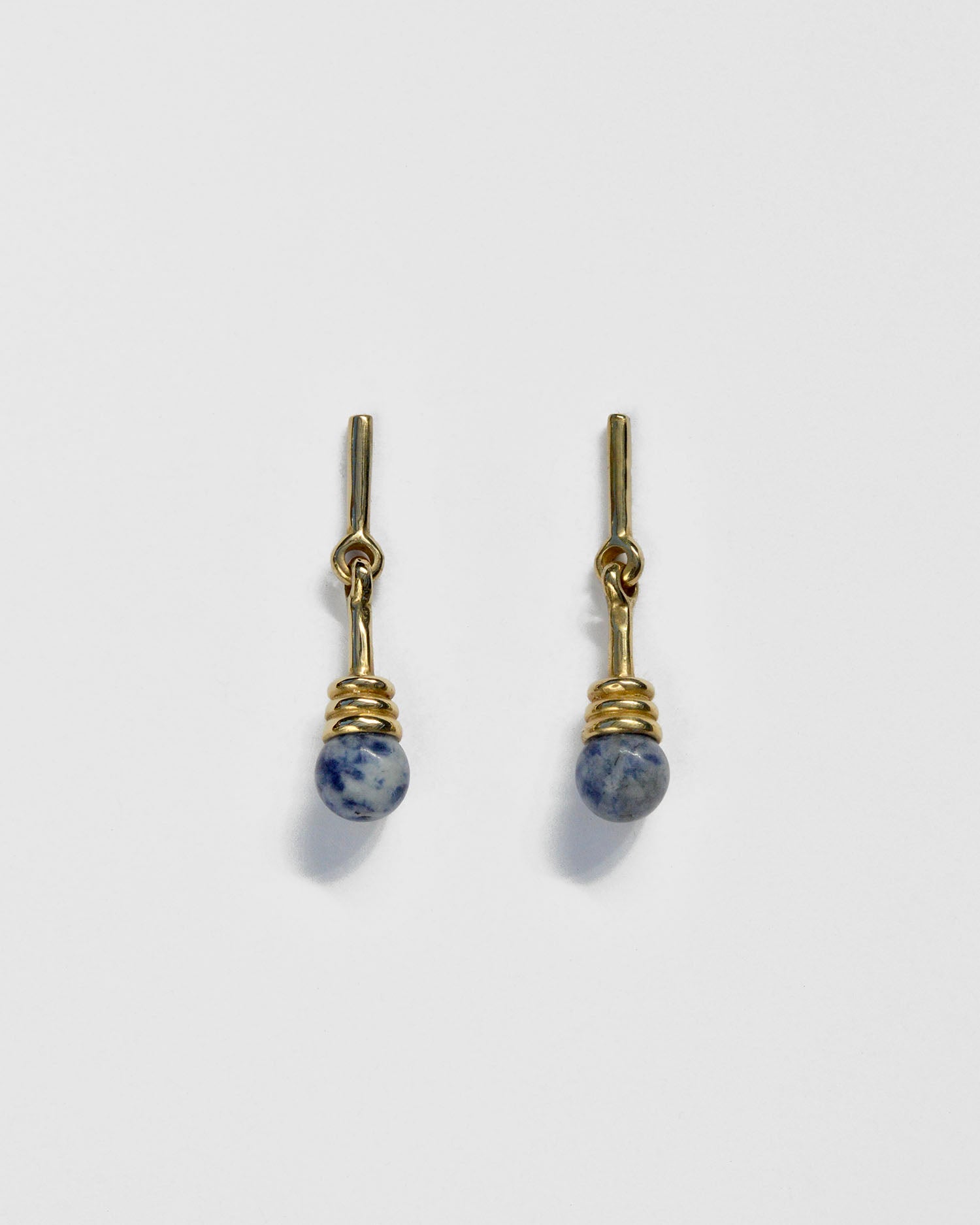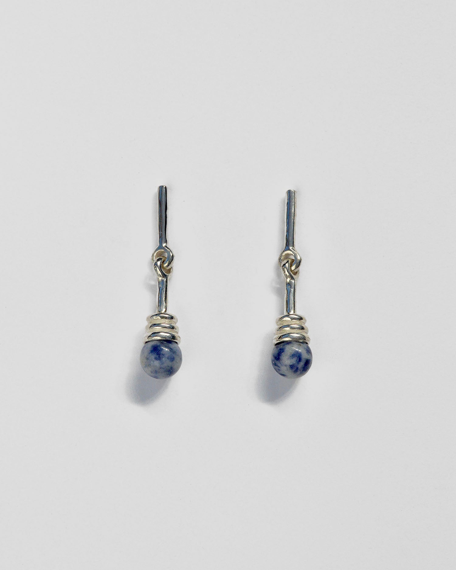 Solid brass or sterling silver settings with blue jasper spheres measure 1.8" x .5" and weigh 6 grams each.