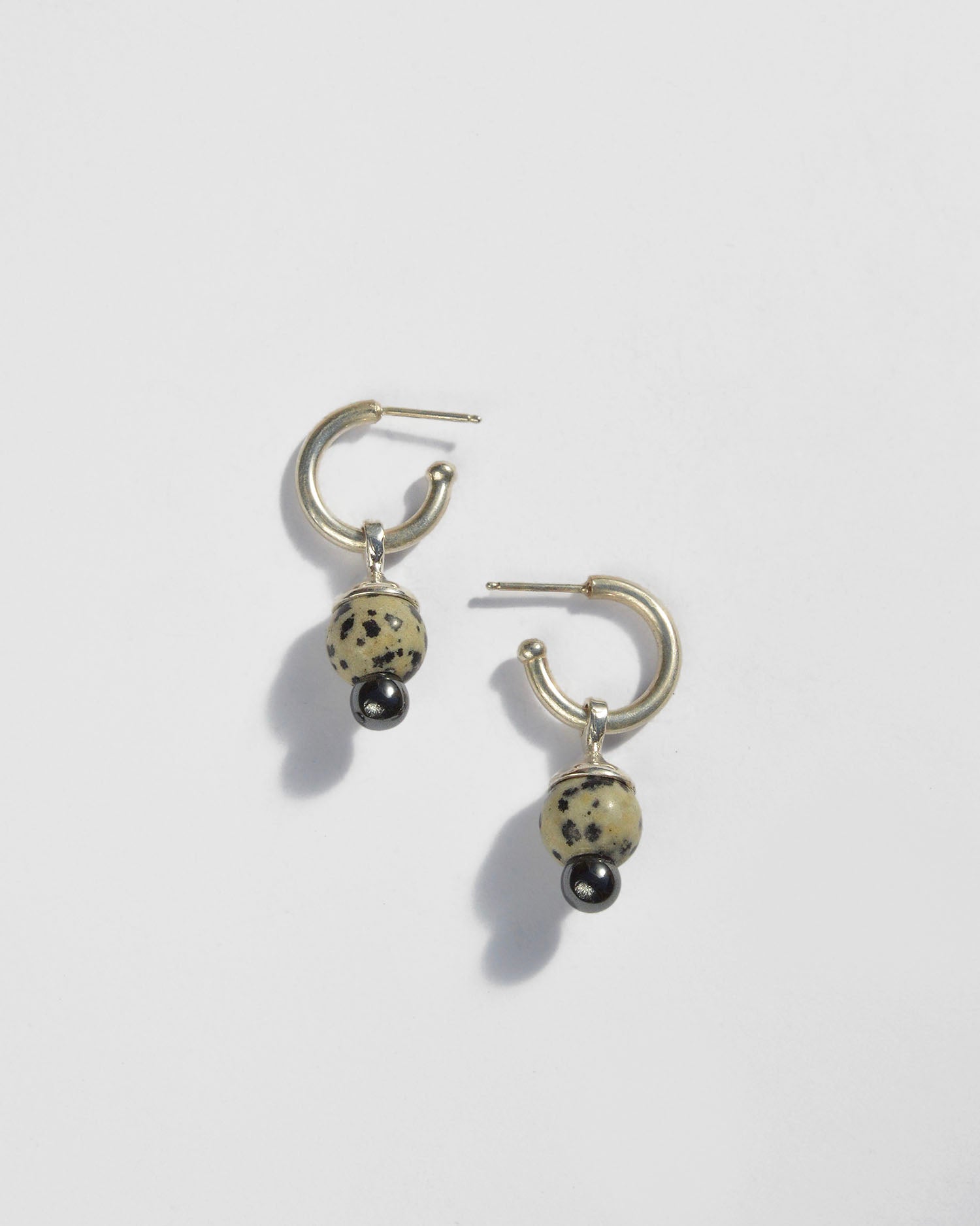 These playful hoops are your new everyday go-to pair. Modular silver hoops with removable Dalmatian jasper and hematite drops.