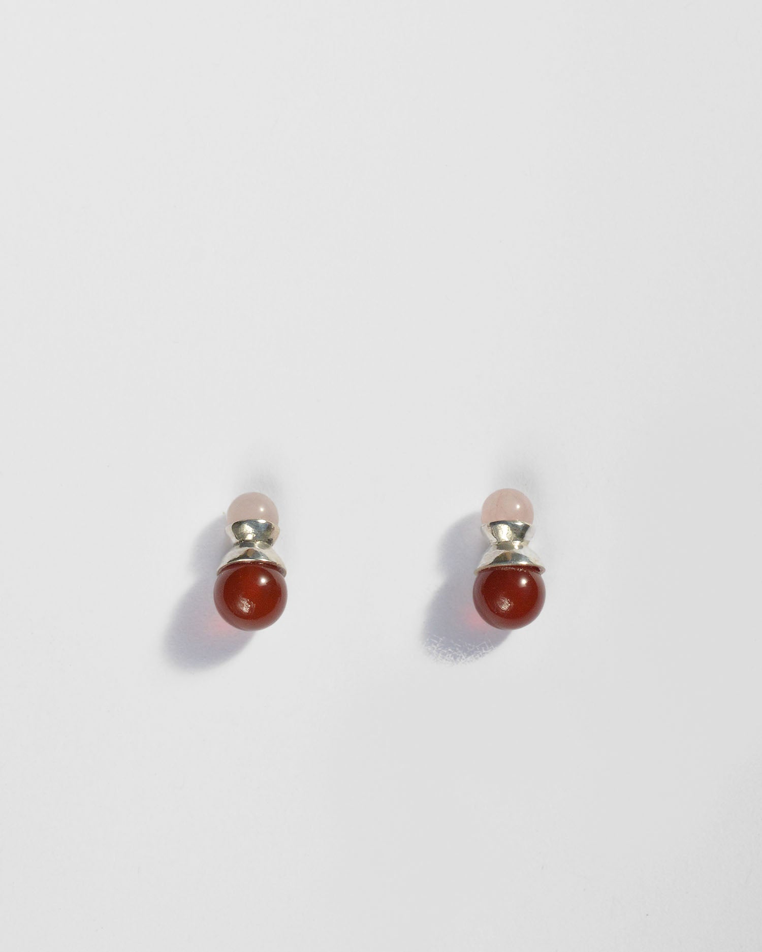 Sweet carnelian and rose quart studs, joined with either a brass or silver setting.