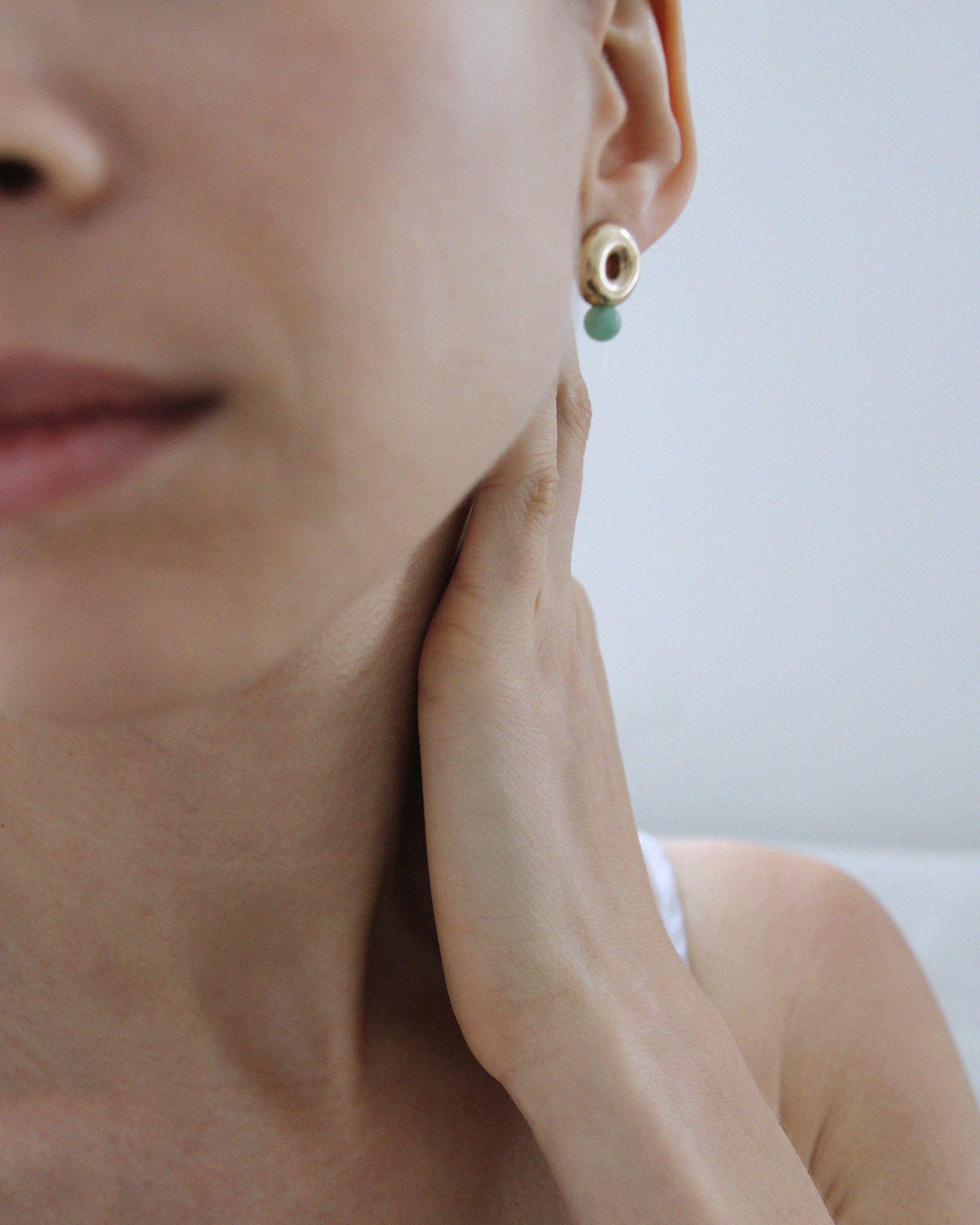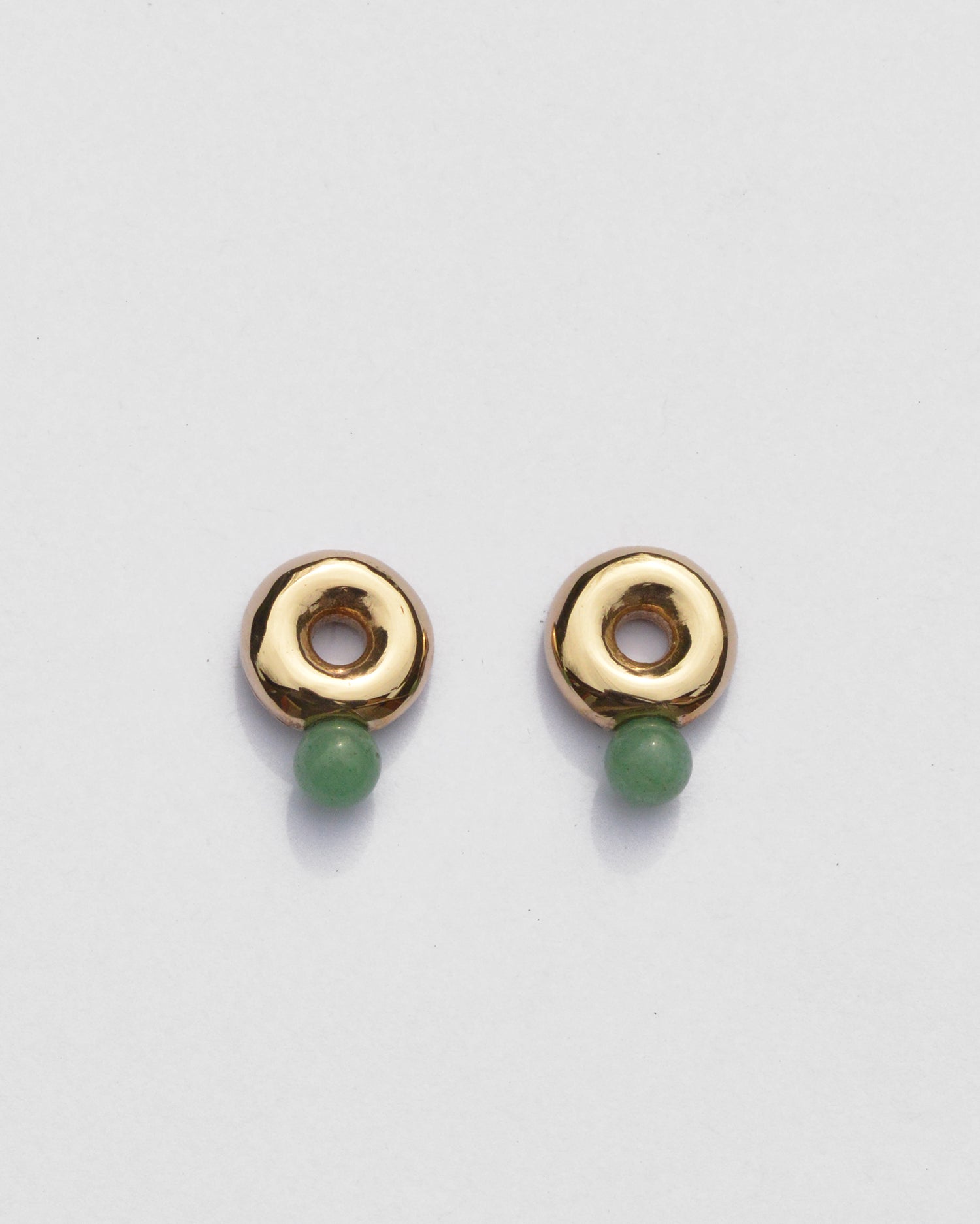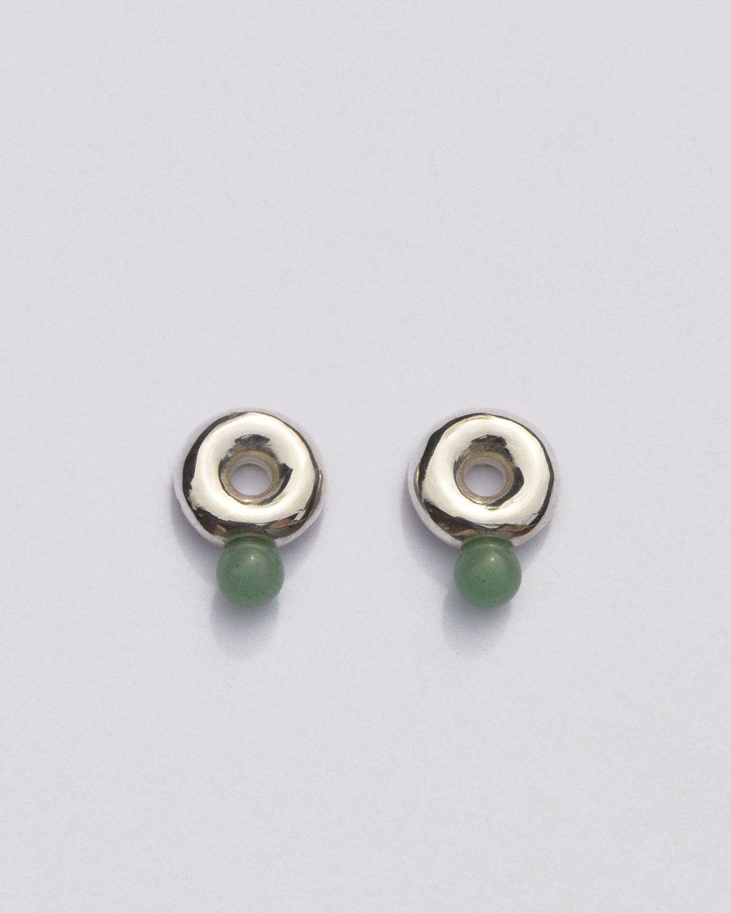 The smaller cousin to our Albers Earrings. Sculpted circular studs in solid brass or silver, set with soft green aventurine spheres.
